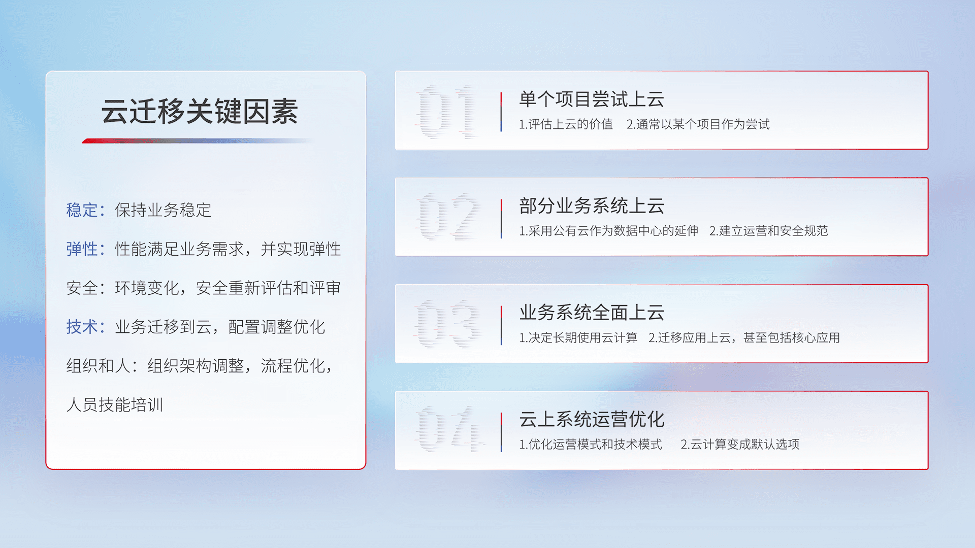 结合实际业务,,,从规划设计、、、、云平台选型、、云原生改造、、数据迁移、、、、集成交付,,,,迁移全过程为客户识别最佳上云路径,,,,做好风险识别管理,,,设计网络架构、、、、身份权限、、安全审计合规、、、、操作审计、、日志审计、、、监控告警策略、、、、多站点容灾设计等,,,,对云上基础设施进行整体规划,,,,提升IT治理水平,,,以满足弹性、、、高可用、、高性能的需求。。。