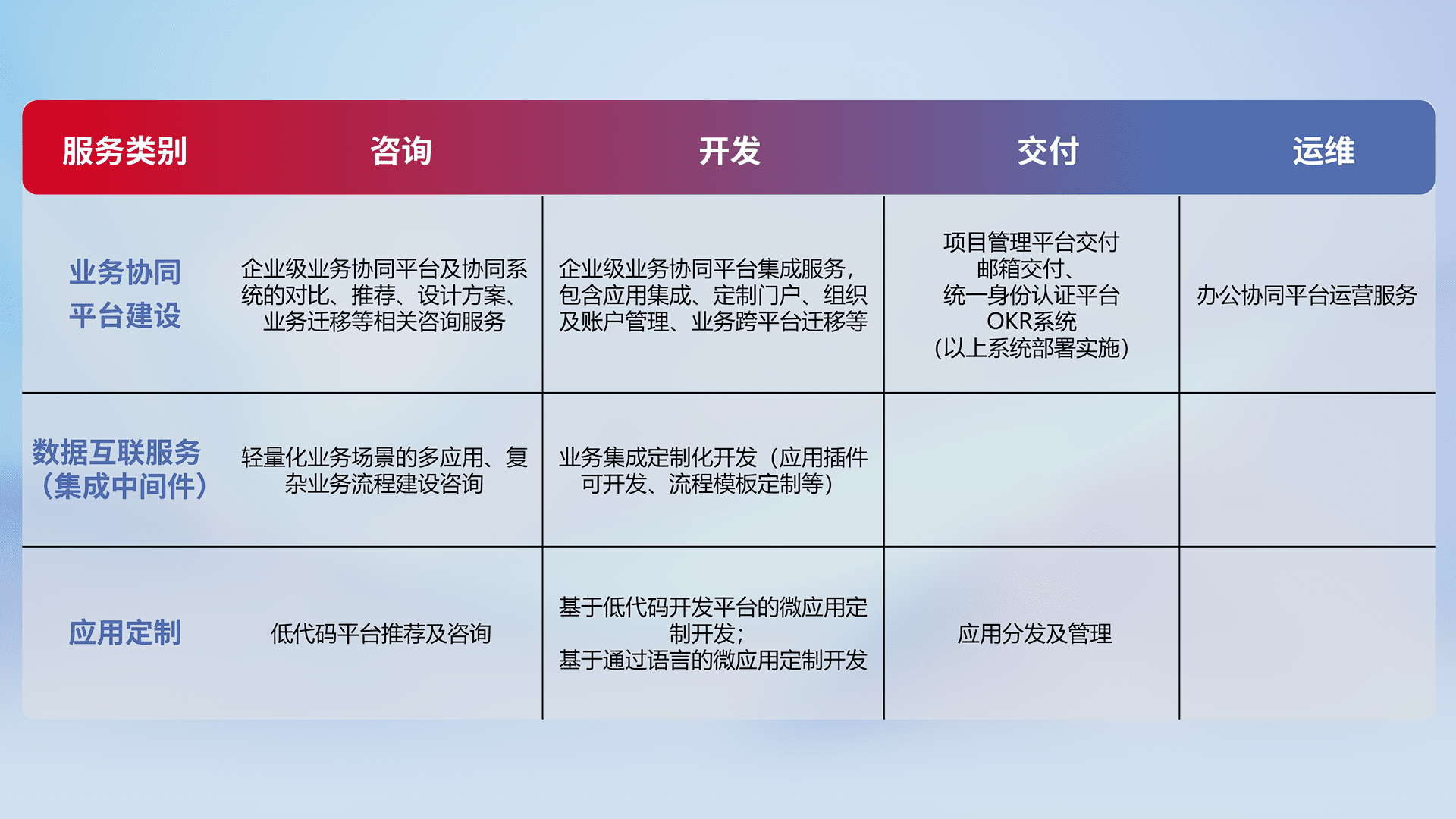 针对钉钉、、、、企微、、IDaas等平台级产品提供产品的规划、、方案、、、交付、、、、定制化开发等服务,,,实现如统一协同办公、、智能客户服务、、、、混合会议管理、、智能数据查询、、、等业务场景,,,,实现数字化转型。。